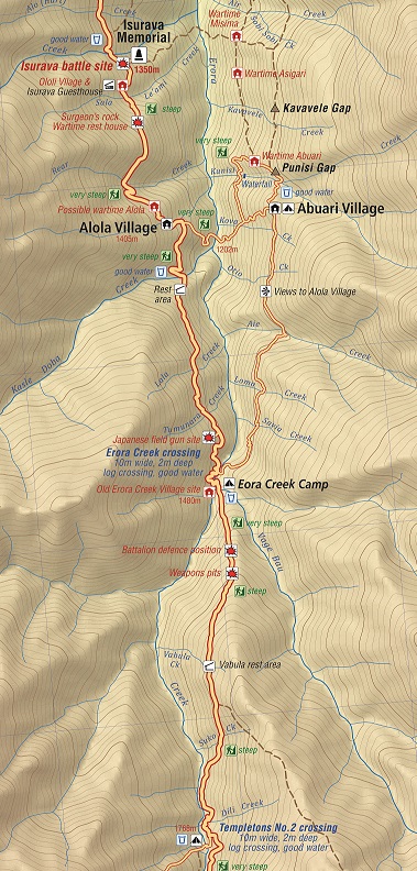 The track continues northwards out of the village. About 20 minutes along is a clear ridge where the wartime village of Alola was located. It is now an abandoned site. The track then follows the ridgeline across numerous creeks – Belave, Aya Dakatni, Evoya, and Ololi to the rear of the Isurava battlesite at Alo Creek (named ‘Back Creek’ by Lt Col Ralph Honner to delineate the rear of his defensive position).